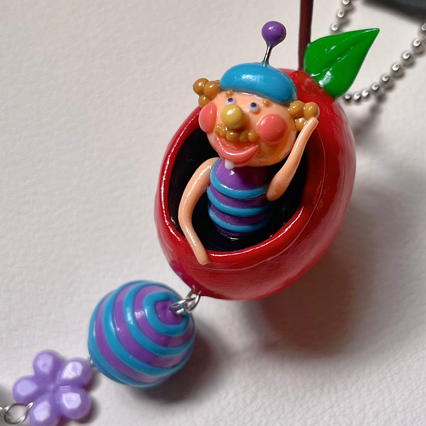 下にぶら下げている大きめの丸いパーツは、アクリルビーズの表面に樹脂粘土で造形しています。