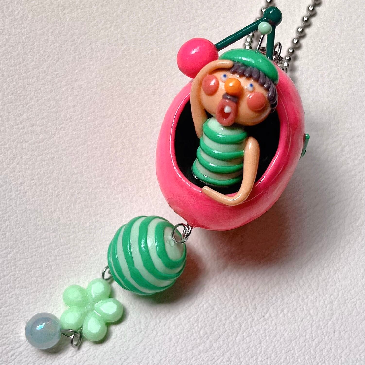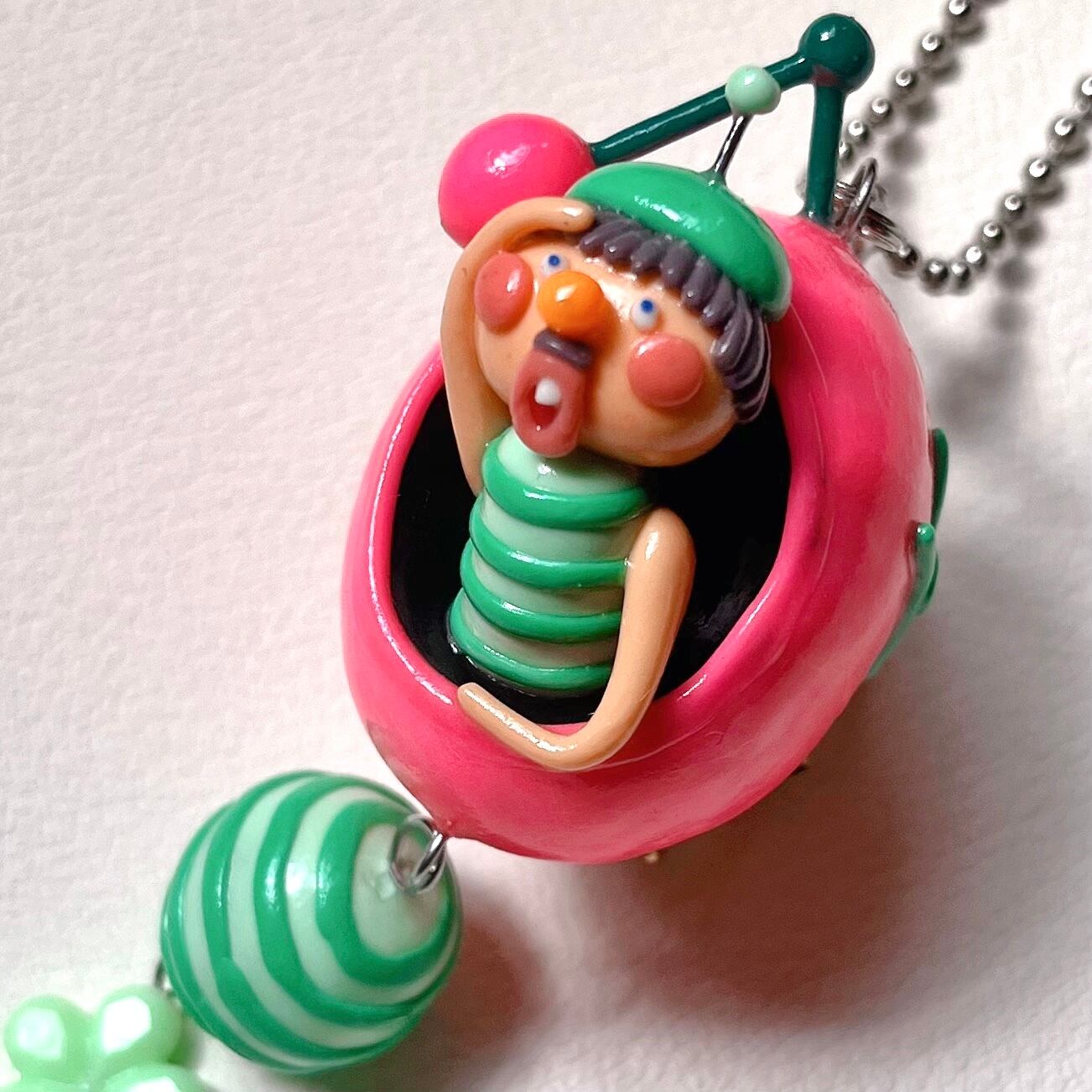 下にぶら下げている大きめの丸いパーツは、アクリルビーズに の表面に樹脂粘土で造形しています。