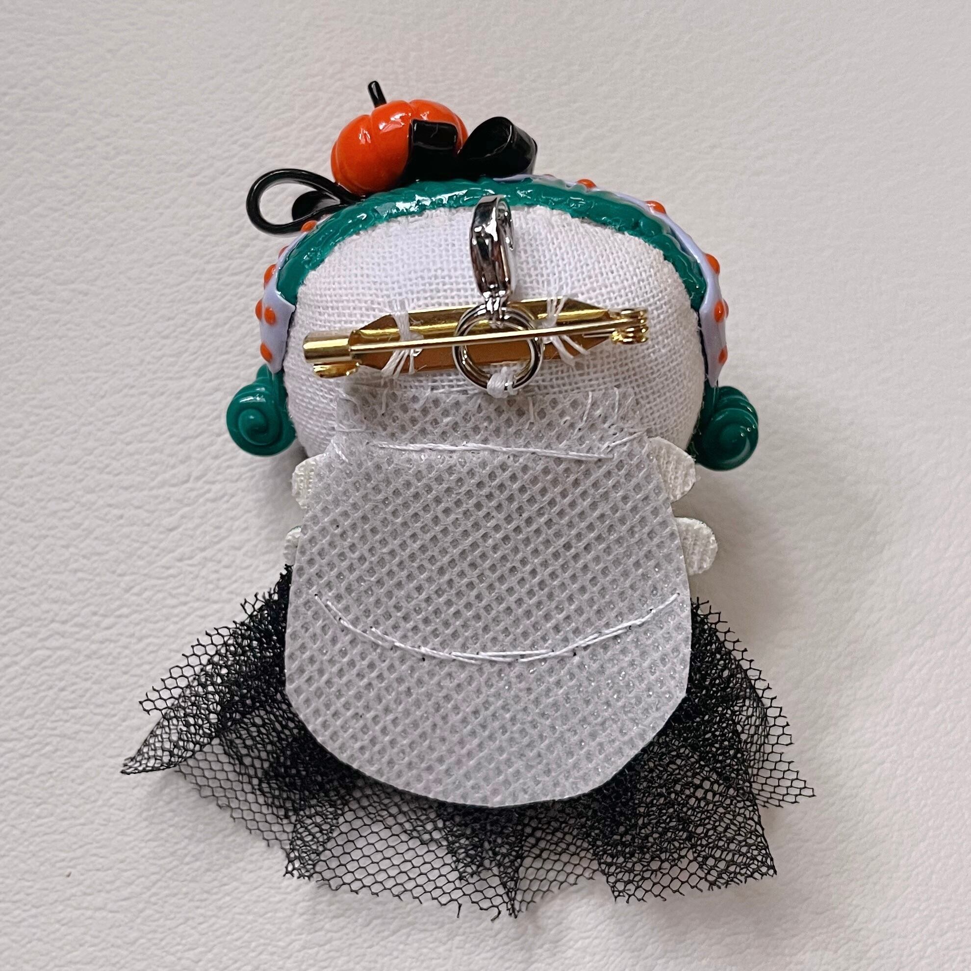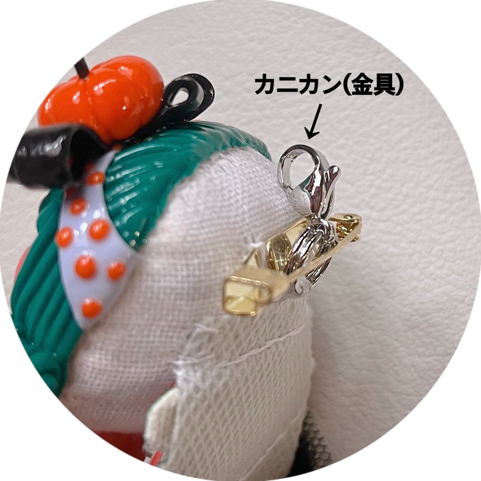 裏面のブローチ金具付近にカニカン金具を縫い付けているので、何かにぶら下げてチャームとしてもお使い頂けます。