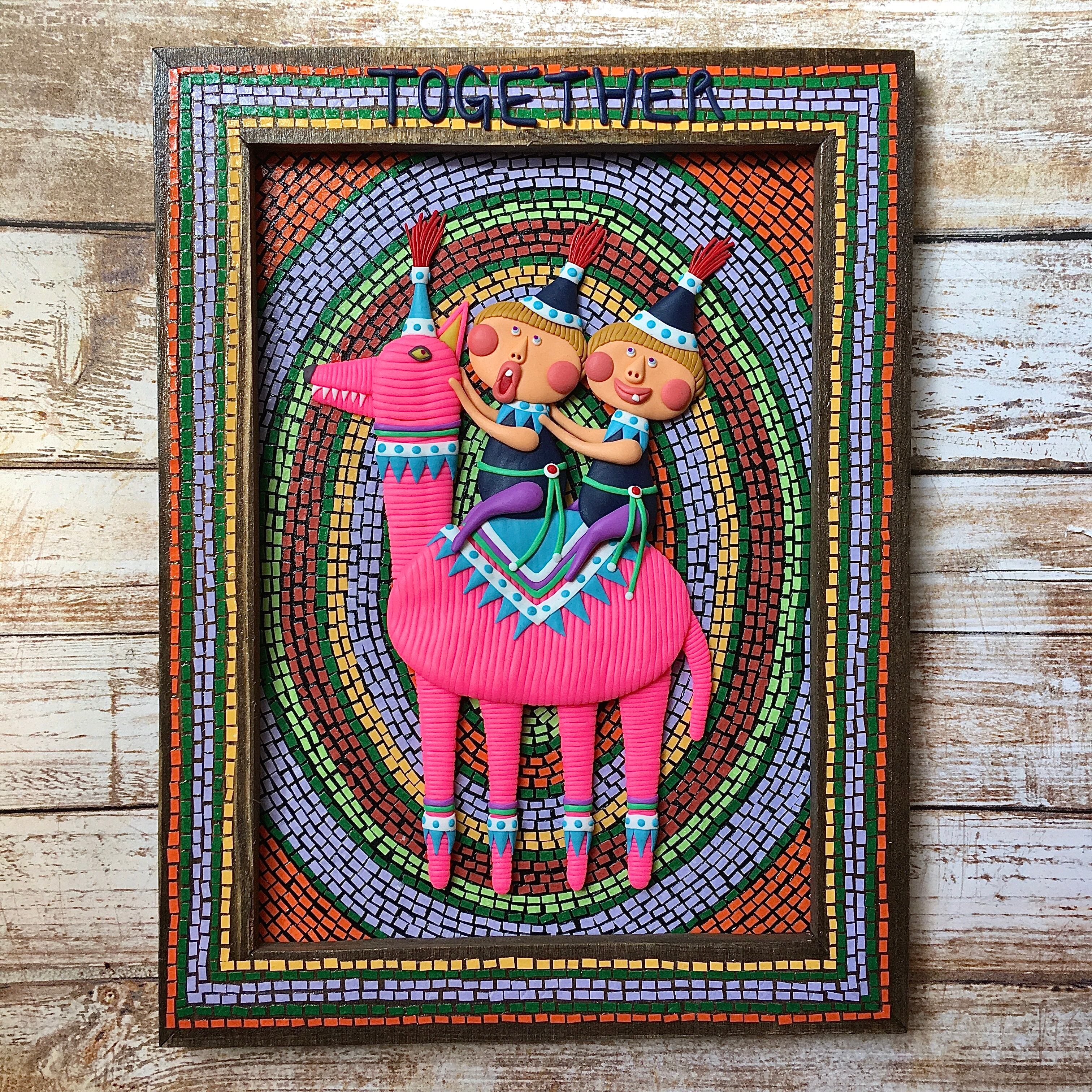 細かく細かく切った折り紙をモザイクタイルの様に貼り付けていってます。フレーム周りも同様です。